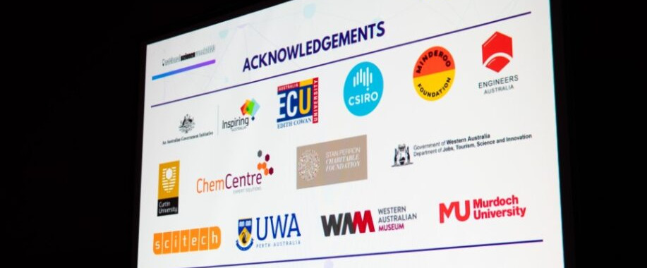 Lastly, we would once again like to thank our partners. Without their continued support we would not be able to deliver this event: ChemCentre, CSIRO, Curtin University, Department of Jobs, Tourism, Science and Innovation, Edith Cowan University, Engineers Australia, Minderoo Foundation, Murdoch University, Scitech, Stan Perron Charitable Foundation, The University of Western Australia, WA Museum.